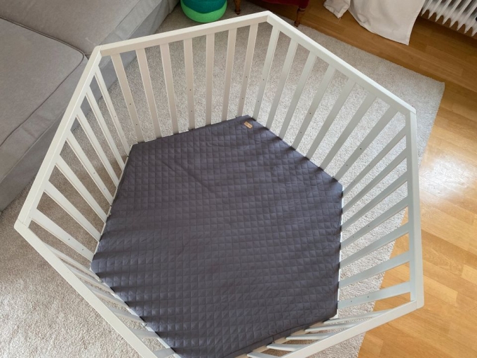 6-eckiges Laufgitter von Roba in der Farbe Weiß mit einer weich gepolsterten, gesteppten anthrazitfarbenen Stoffeinlage (waschbar)