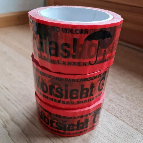 Ich biete hier 3 neue Rollen rotes Klebeband mit der Aufschrift "Vorsicht Glas". Ideal für den Umzug oder zum Versenden von zerbrechlicher Ware. Die Rollen sind neu und unbenutzt.