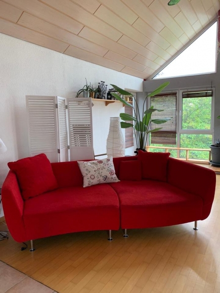 Rotes Sofa zu verschenken! Kann durch Decken (siehe letztes Bild) umgestaltet werden. Sofa ist aber ohne Decken abzugeben. Abholung in Bochum Stiepel