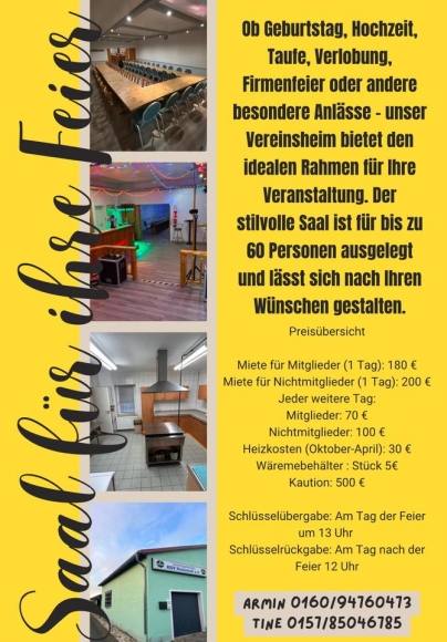 Ob Geburtstag, Hochzeit, Taufe, Verlobung, Firmenfeier oder andere besondere Anlässe – unser Vereinsheim bietet den idealen Rahmen für Ihre Veranstaltung. Der stilvolle Saal ist für bis zu 60 Personen ausgelegt und lässt sich nach Ihren Wünschen gestalten.