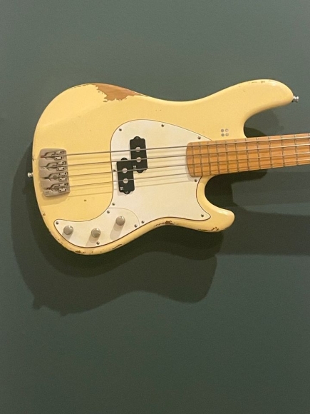 Korpus aus Erle, Hals aus Ahorn. Derzeit sind La Bella Flatwound Saiten aufgezogen für den original P- Bass Sound, ich lege aber auch Roundwounds dazu.