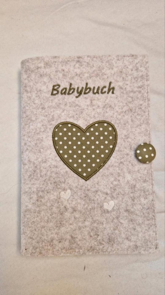 Es ist in einem hellgrauen Wollfilz-Einband mit aufgesticktem Schriftzug „Babybuch“ und einem süßen Herzmotiv mit weißen Punkten. Der Knopfverschluss ist farblich passend gestaltet.