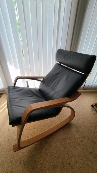Ich verkaufe einen wenig benutzten IKEA Schaukelstuhl Poäng mit braunen Lederbezug.