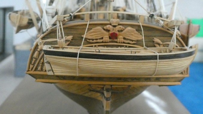Modellschiff, absolutes Unikat. Wurde in den 90zigern in Russland erworben. Der Rumpf ist unten mit Kupferplatten versehen, ist auf den Bildern nicht gut zu sehen:) Der Erbauer hat sich in einer Kupfeplatte am Kiel verewigt. (siehe das 15. Bild)