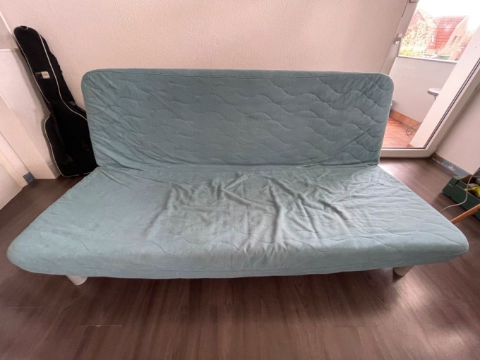 Es handelt sich um das Ikea Bedding altes Modell. Das Sofa ist in einem guten Zustand, Gebrauchspuren sind aber vereinzelt sichtbar. Die Maße sind: Breite 200cm, Tiefe 97 cm und Höhe 90 cm. Ausgeklappt wird es zu einem 1,40m Bett. Der blaue Überwurf ist mit dabei, kann aber einfach ersetzt werden.
