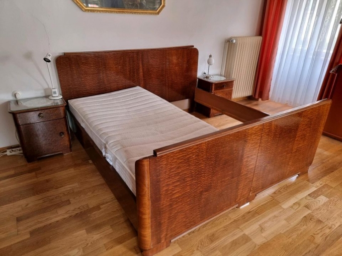 Schrank , Doppelbett ( mit Matratzen und Lattenrosten), Nachkästchen, Frisierkomode