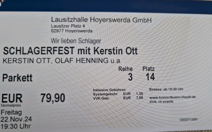 Aus Privaten Gründen muss ich leider unsere Karte für das Schlagerfest mit Kerstin Ott, Olaf Henning und viele anderen verkaufen!