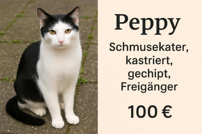 Der hübsche und menschenbezogene Kater Peppy (geb. Frühjahr 2023) sucht ein neues, liebevolles Zuhause mit Freigang. Er ist kastriert, gechipt, stubenrein und gesund.
