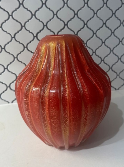 schöne gerillte Vase aus hochwertigem, dickem Glas. Orange und schimmerndes Gold. Wie neu.