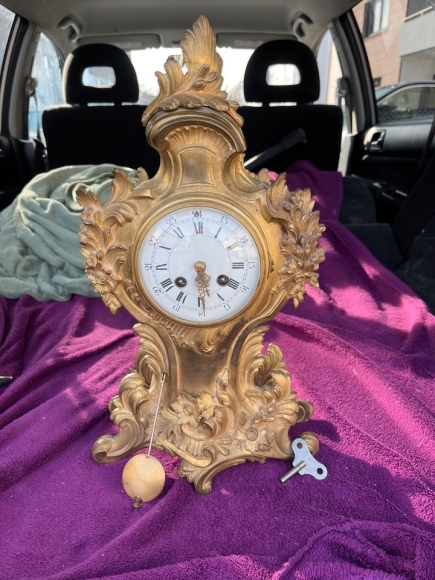 Hiermit bitte ich eine sehr schöne Alte Kaminuhr mit Schlüssel und zwei Pendeln an.