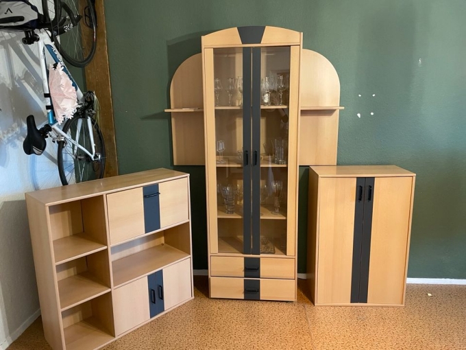 Wir verschenken unsere gebrauchte Schrankwand. Sie ist noch intakt, bis auf eine Schublade, die hakt. Etwas kann man aber mit handwerkliche Geschicklichkeit gut ausbessern.