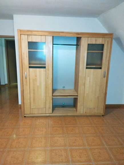 Wie auf den Bildern zu sehen hat der Schrank zwei Schiebetüren links und rechts und in der Mitte ist ein Fernseh bzw Regal teil.