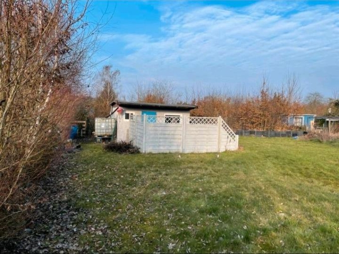 Es gibt Strom-und Wasseranschluss! Das Grundstück ist ca. 530qm groß. Darauf steht eine abschließbare Steinhütte.