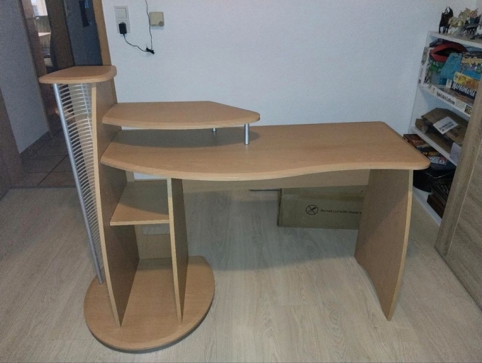 Moin verkauft wird hier ein Schreibtisch, eine kleine Macke am Tisch siehe Foto, der CD Halter ist aus Kunststoff. Die Maße sind auf dem letzten Bild zu sehen.