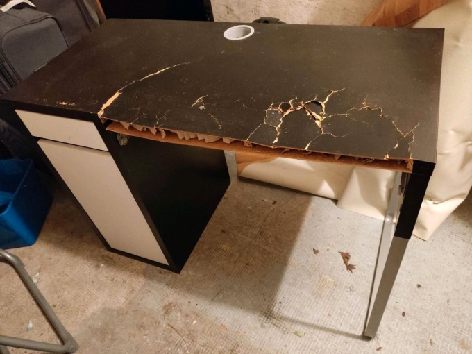 Schreibtisch, der definitiv schon bessere Tage gesehen hat, sucht ein neues Zuhause