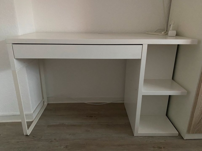 Regal an der rechte Seite des Schreibtisches von vorne und von der Seite nutzbar.