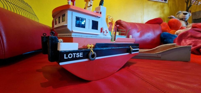 Mit Rauch ,Beleuchtung, Wasser pumpe zum spritzen Rumpf aus Kunststoff, kein Holz .Mit Diesel Soundmodul neuer Motor,Und Servo ,Ständer.Radar beweglich