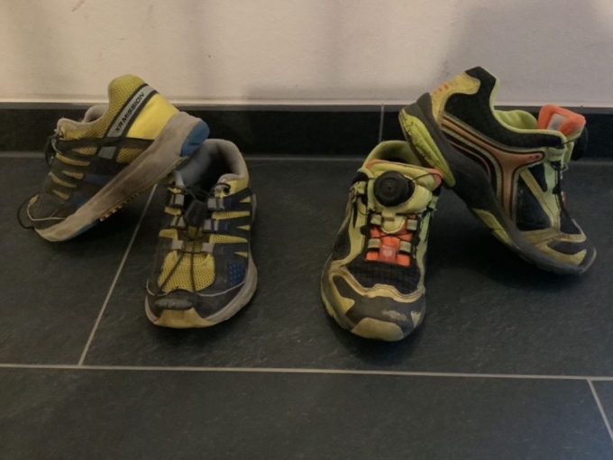 Zwei Paar gebrauchte Schuhe, die für Spielplatz, Scheune oder was auch immer noch okay sind (bei uns heißt sowas Räuberklamotten bzw. -Schuhe). Haben Gebrauchsspuren, siehe Bilder.