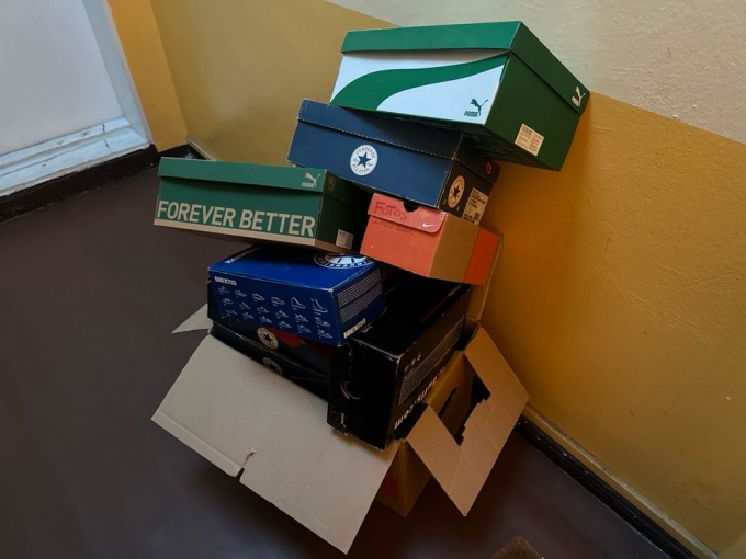 Verschenke an Selbstabholer, circa zehn Schuhkartons und einen Umzugskarton