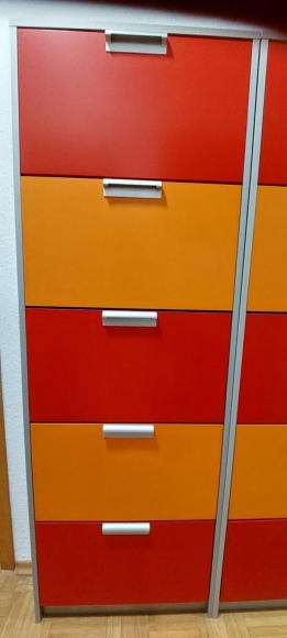 Ein Schuhschrank mit 5 übereinander befindlichen Fächern für jeweils min. 2 Paar Schuhe. Ca. 171 cm hoch, 59 cm breit und 18 cm tief. Zustand gut, Details siehe Bilder.