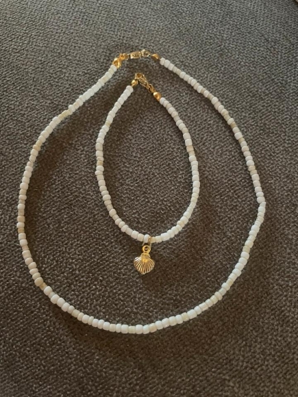 Ich biete ein handgefertigtes Set bestehend aus einer Kette (32cm) und einem Armband (18cm) mit Muschelanhänger (Edelstahl, vergoldet)