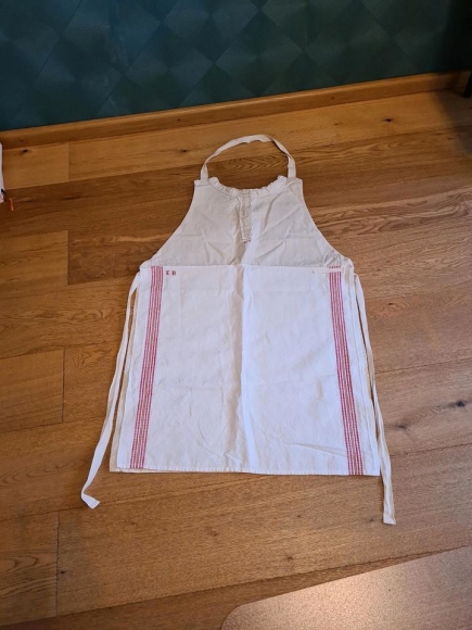 Die Schürze wurde in einem französischen antiken Wäschegeschäft in Lourmarin/ provence kekauft, nie getragen, sie lag nur im Schrank. Es handelt sich um eine Handarbeit aus verschiedener Weißwäsche, sie ist daher ein UNIKAT und kostete 60 Euro. Sie besticht durch das eingearbeitete Handtuch (siehe letztes Foto), mit dem man sich während der Kchenarbeit die Händeabtrocknen kann, sehr selten zu finden und besonders praktisch.