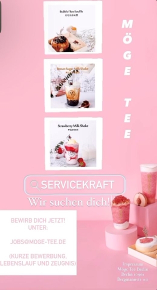 Die MögeTee Berlin, ein führender Name in der Welt der Premium-Tees und speziellen asiatischen Desserts, freut sich, eine fantastische Gelegenheit zur Verstärkung unseres Teams als Servicekraft bekannt zu geben. Wir suchen eine qualifizierte und engagierte Person, die in unserem neuen Geschäft in Berlin außergewöhnliche Serviceerlebnisse bietet und die hohen MögeTee-Standards aufrechterhält.