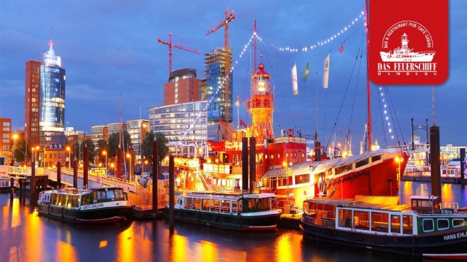 Direkt im Hamburger City Sporthafen liegt unser Restaurant – Café – Bar – Pub – Cabins "Das Feuerschiff".