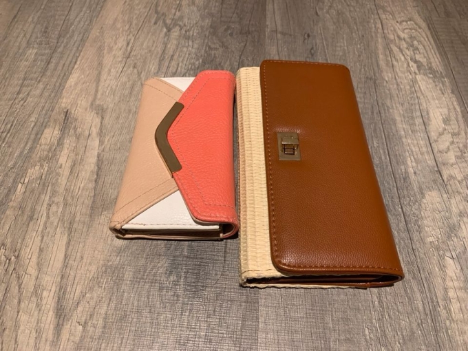 Der braune Geldbeutel ist wie neu, der Korallenfarbene in einem guten Zustand.