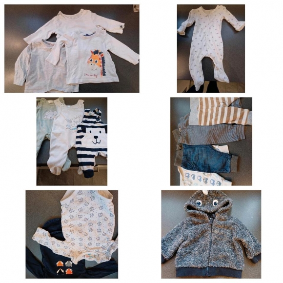 Das Set passt ab Größe 56 bis 62. Alles wenig getragen. Bei dem blau weißen Strampler ist die Naht falsch genäht. Siehe Foto. Habe ich nach dem Kauf zu spät gesehen.