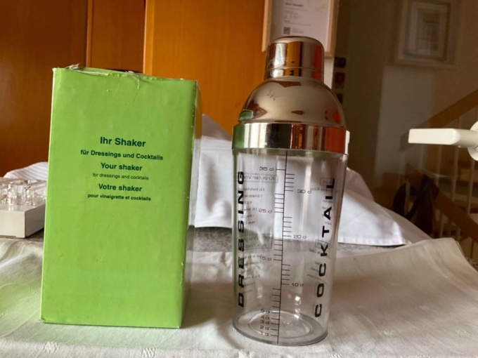 Shaker für Dressings oder Cocktails aus Kunststoff im Originalkarton, ungebraucht mit aufgedruckten Rezeptvorschlägen für Cocktails und Vinaigrettes