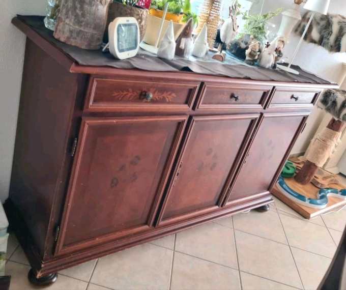 Das Sideboard hat nach 35 Jahren übliche Gebrauchsspuren, die aber auf Grund des Echtholzes problemlos nachgearbeitet werden können.