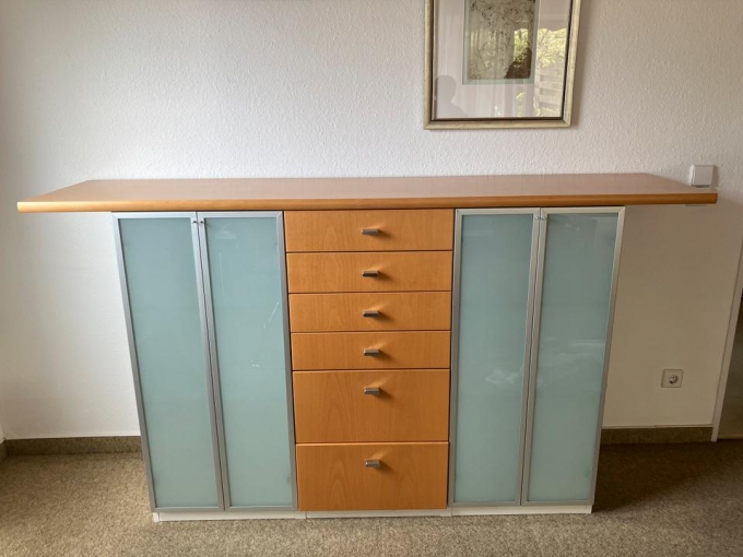 2 Vitrinen mit gefrosteten/satinierten Glastüren und verstellbaren Glasböden. Sowie Mittelteil mit 6 leichtlaufenden Schubladen.