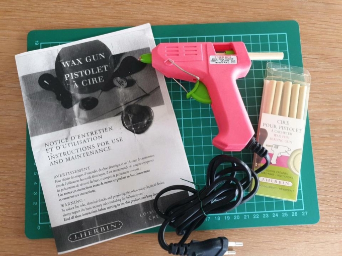 Jedes Set besteht aus Pistole, Anleitung + angefangene Packung Siegelwachs in dunkelblau oder cremefarben (eine Stange fehlt)