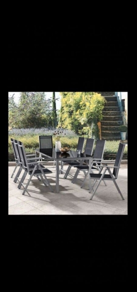 Produktbeschreibung.Die 9-teilige Aluminium Gartengarnitur Milano mit großem Tisch und acht Stühlen ist ein perfekter Sommerbegleiter für Frischluft-Genießer.Verbringen Sie Spieleabende,