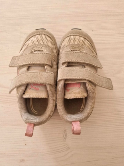Wir verkaufen gut erhaltene Sneaker von Puma in weiß/grau/rosa. Die Sohle und die Innensohle sehen aus wie neu. Siehe Bilder.
