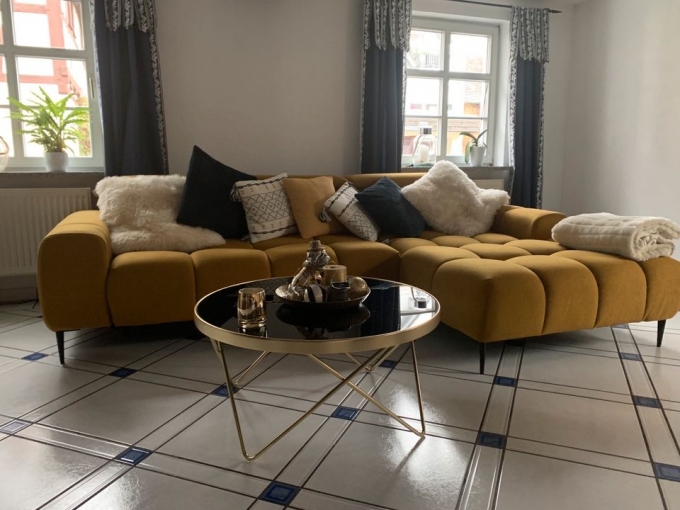 Ecksofa gelb/ocker, modern mit schwarzen Füßen, elektrische Sitztiefenverstellung per Knopfdruck, Kopfstützen aufklappbar, gekauft 09.07.22, wie neu, Neupreis XXXL 1.286 Euro, umständehalber abzugeben. Rechnung vorhanden, noch Garantie 2,70 x 1,80