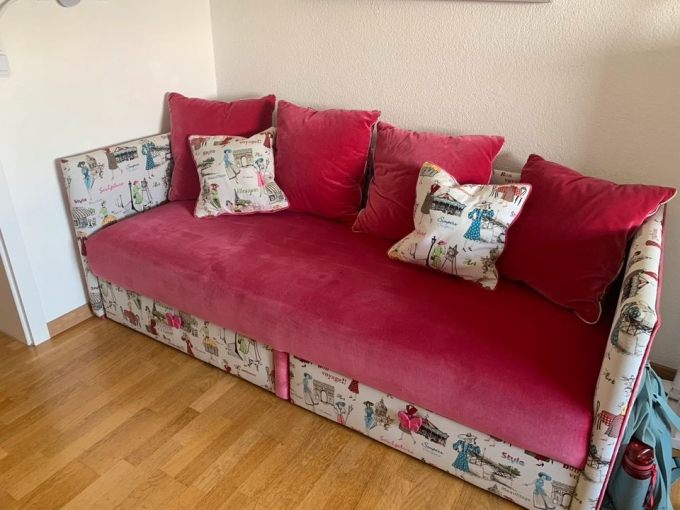 Verkaufe von meiner Tochter ein super erhaltenes Sofa. Massen 1,90 m x 0,80 m. Sitz oder Liege Fläche 1,80 m x 0,75 m. Das Sofa hat zwei Fächer für Kissen oder anderen Sachen oder Spielzeuge usw. Stoff ist Samt und an den Seiten Mischgewebe. Griffe an den Schubladen sind Schmetterlinge. Handmade von einem Polsterfachmann. Sechs Kissen sind dabei…nicht Raucher Haushalt, keine Tiere wegen Allergien.