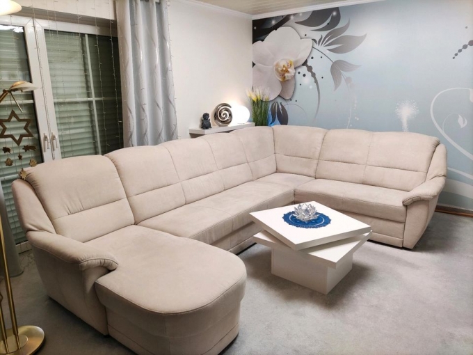 Verkaufe diese guterhaltene Sofagarnitur in U-Form. Der Stoff ist Mikrofaser/Velour in beige. Der Rücken ist Echtstoffbezug. Es gibt keine Beschädigungen. Auf der linken Seite befindet sich noch ein Staufach.