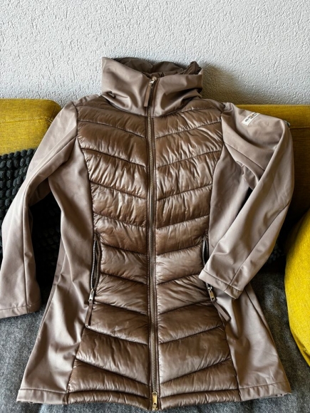Damen Jacke in beige , Größe XL, in beige mit goldenem Reißverschluss ( 2 Wege ) sehr edel und schick - fast zu fein für den Stall - mit Reißverschlüssen auf der Rückseite- siehe Foto- damit ist reiten unproblematisch. Kapuze innenliegend, siehe Foto.