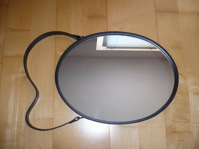 Spiegel mit Metallrahmen und Kunstlederriemen zum aufhängen.
