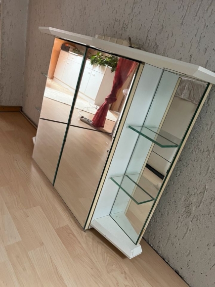 Ich biete einen Badezimmerspiegelschrank mit integrierter, funktionsfähiger Beleuchtung.