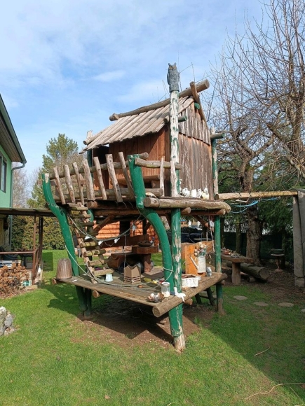 Zum Verkauf steht ein Spielhaus aus Echtholz der Marke Eigenbau mit Rutsche.