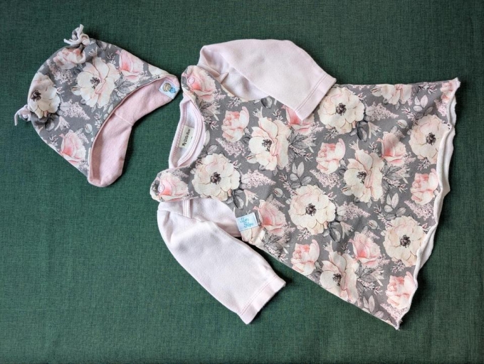 Hier erhalten Sie eine gepflegte Kombination in der Größe 68 bestehend aus einem Kleidchen und Mütze von Mon Filou - Staghorn, einem kurzarm Body, einem Pullover und einer Teddy - Jacke.