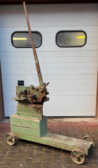 Massive große Blechschere auf Holzsockel und Metallschiene.