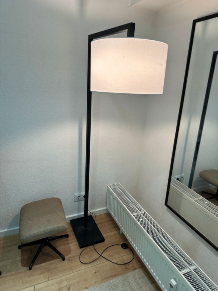 Hiermit verkaufe ich unsere Stehleuchte in schwarz Metall mit einem weißen Lampenschirm. Der Lampenschirm hat ein paar Gebrauchsspuren siehe Fotos.