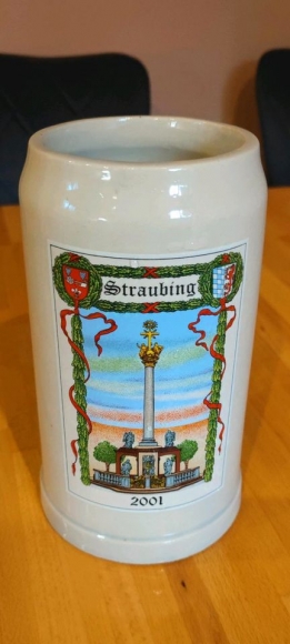 Biete eine Steinkrug mit Straubing-Motiv Dreifaltigkeitssäule.