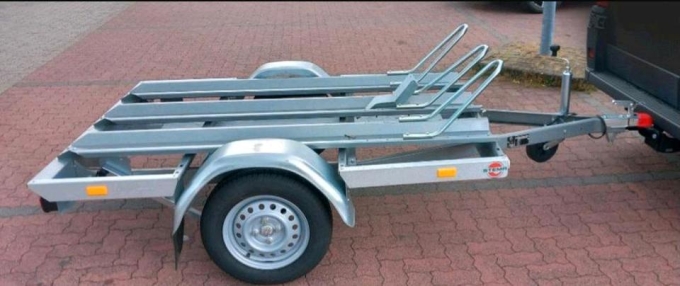 Neuwertiger STEMA MT0750 BS3 Motorradanhänger für den Transport von bis zu 3 Motorrädern.