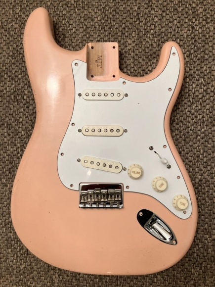 Original MJT VTS Stratocaster Body aus Erle 1,96kg in shell pink mit sehr dezentem Relic. Achtung: Es handelt sich hier um einen Body mit festem Steg (Hard Tail Bridge).