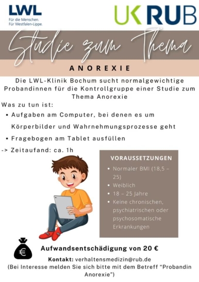 Die LWL-Klinik - Bochum sucht Teilnehmende für eine Studie zum Thema Anorexie. Dabei werden Wahrnehmungsprozesse untersucht. Das bessere Verständnis kognitiver und emotionaler Komponenten der Anorexie kann für die Erforschung und Behandlung von Körperschemastörungen von Nutzen sein.
